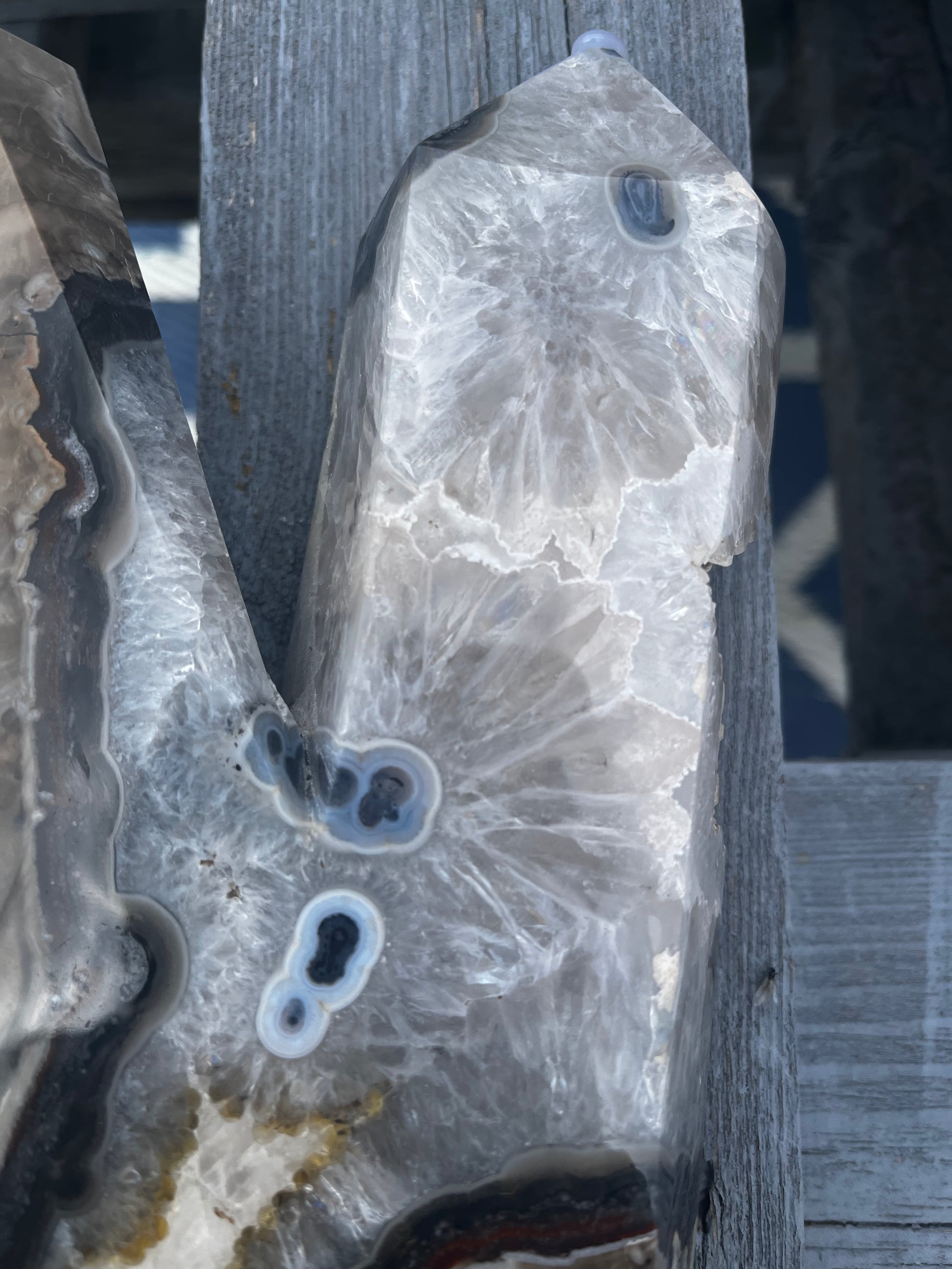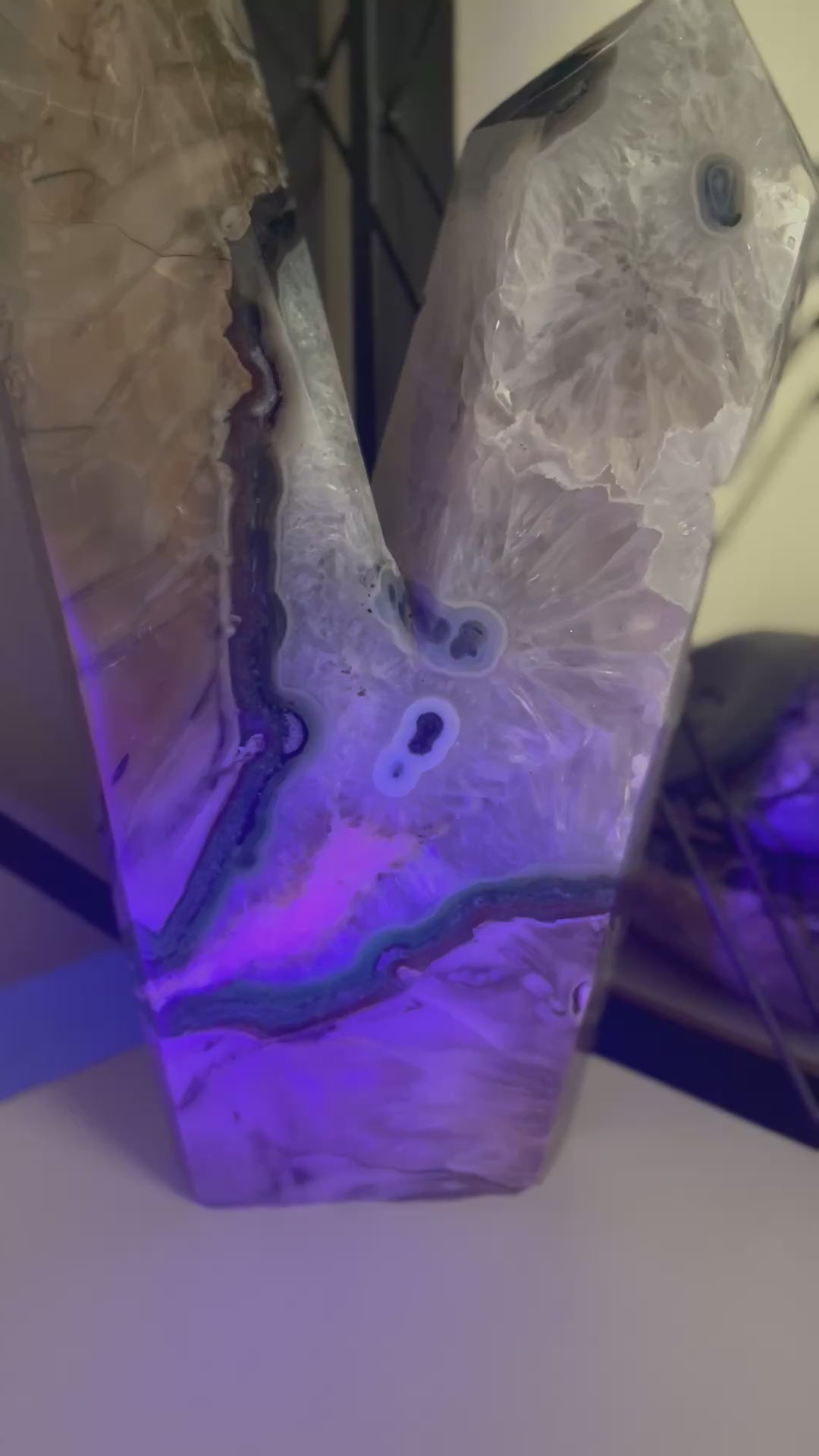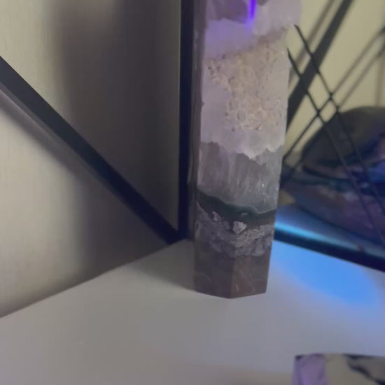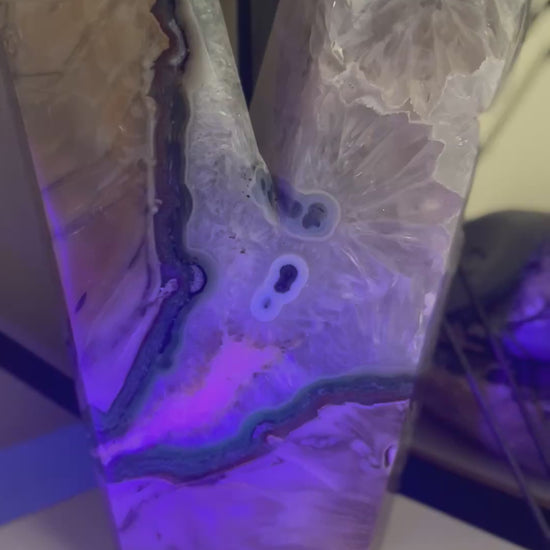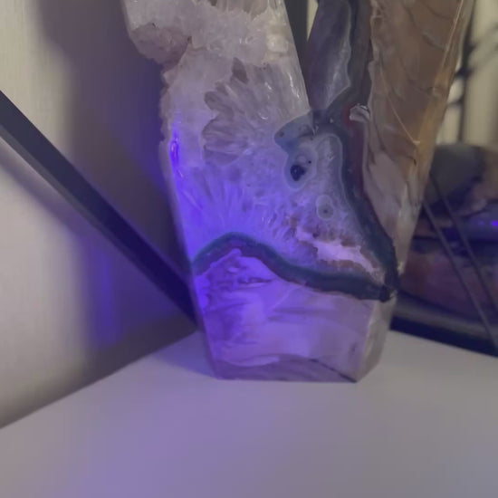 The Volcano Agate piece is a stunning and unique mineral specimen, weighing approximately 2.2kg. The shape of the two point piece is unique and eye catching. This polished piece features a large druzy pocket, which contains stunning sparkling crystals that form on the surface of the stone. The piece is also UV reactive which is visible in the videos, adding an extra element of interest to its appearance. The white crystal area shows beautiful flower shape areas which are mesmerising. At the tallest point this piece measures approximately 25cm and is 14 cm at its widest point. The base approximately measures 8cm and the width of the side is approximately 4.5 cm. Perfect for collectors or those interested in the beauty of minerals and crystals, this Volcano Agate piece is sure to make a striking statement in any space. Please view matching pieces.