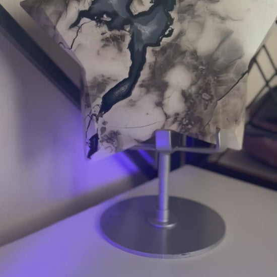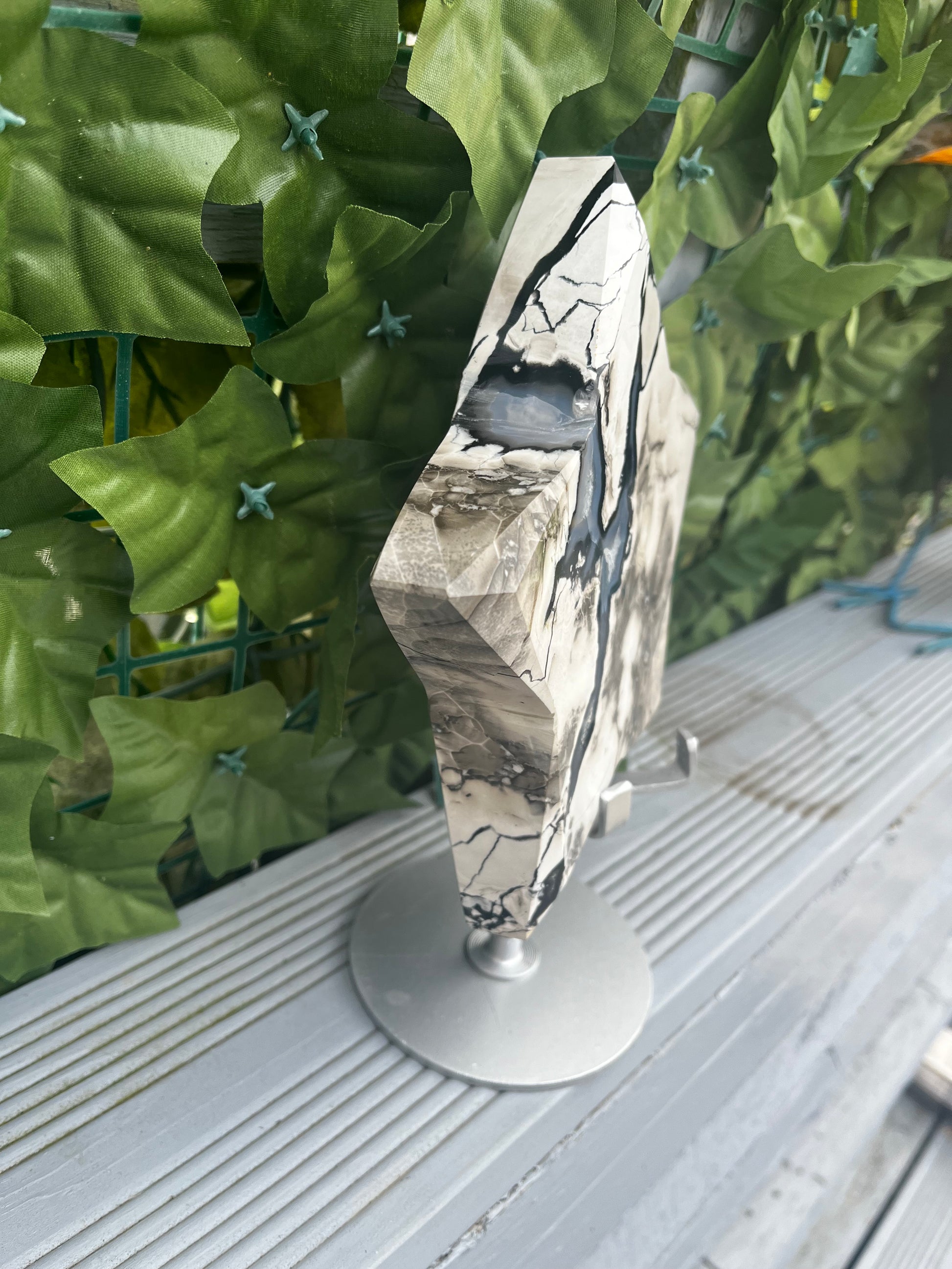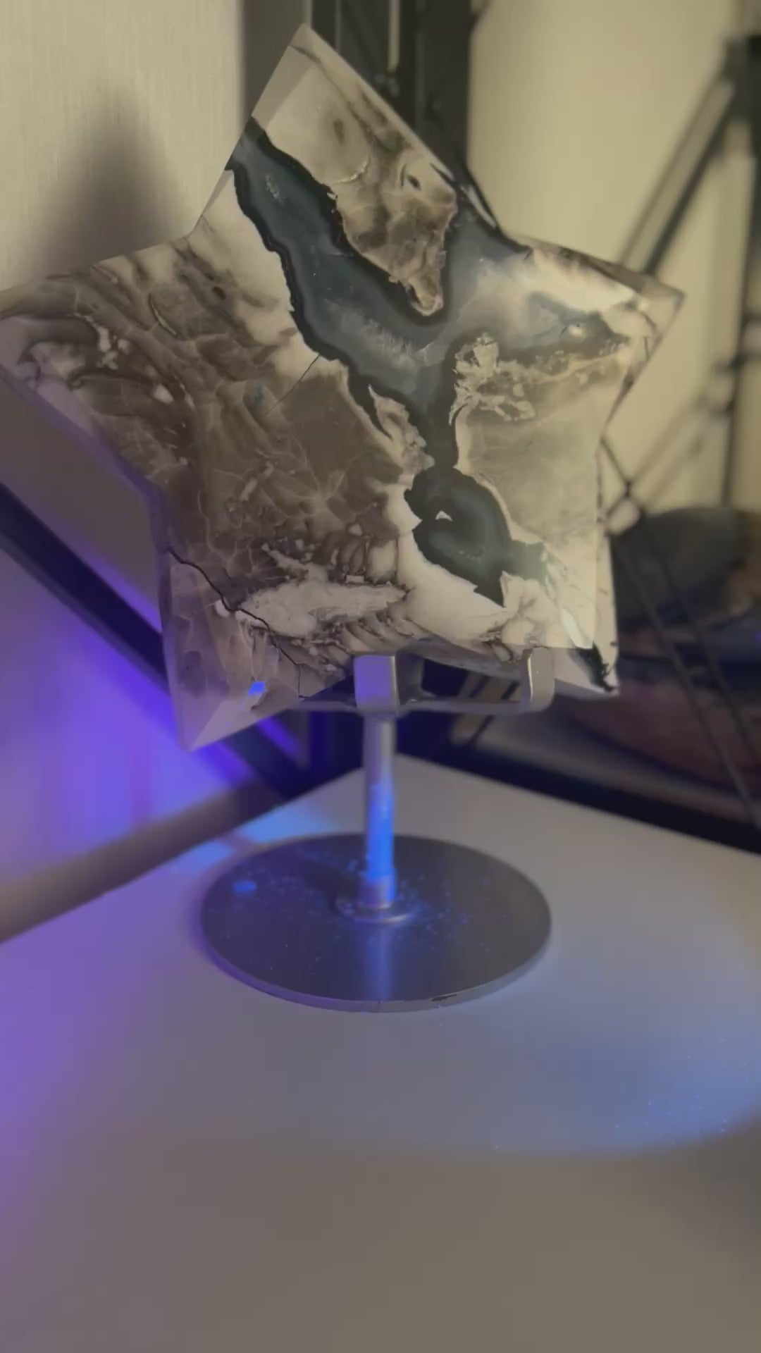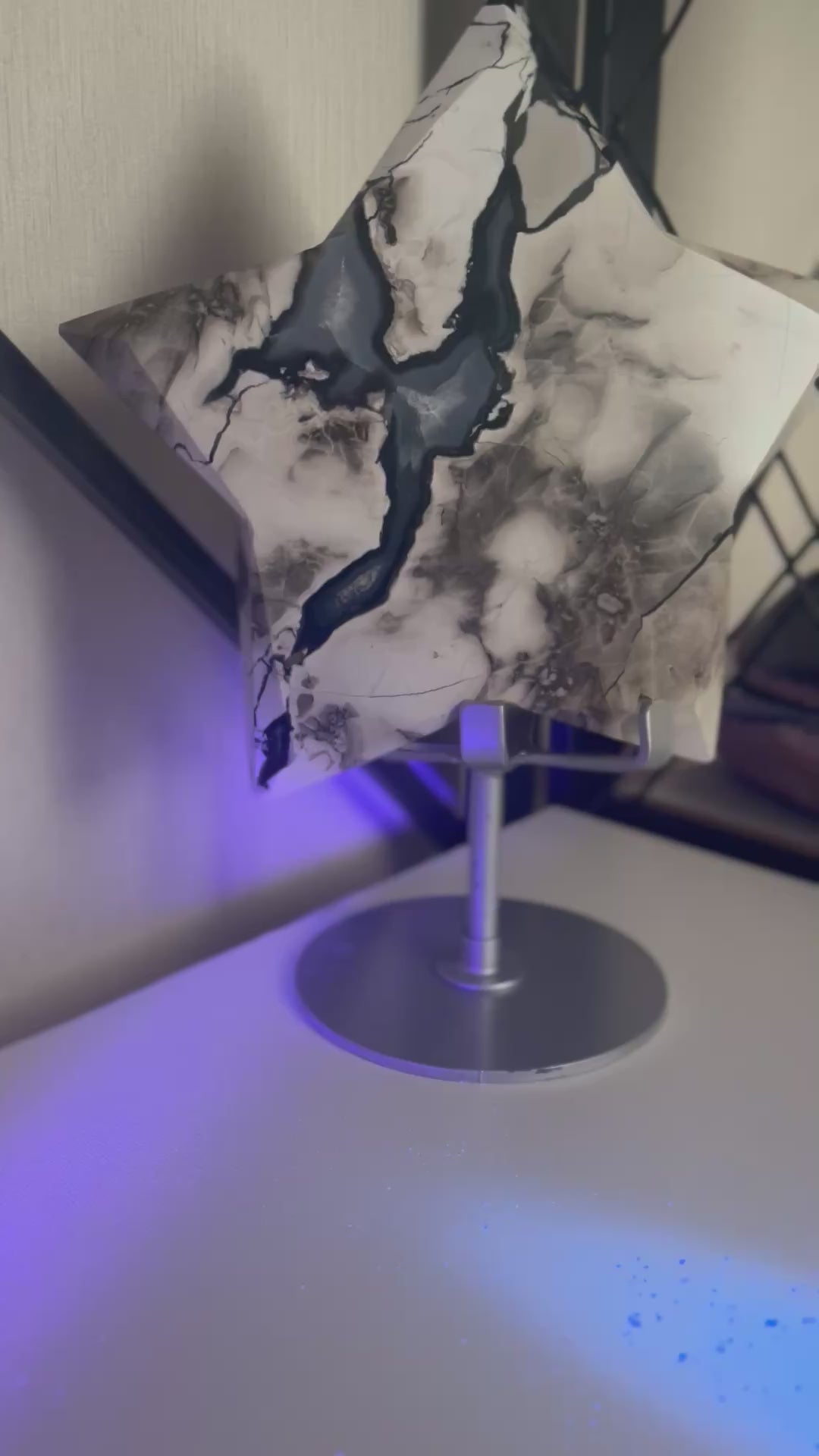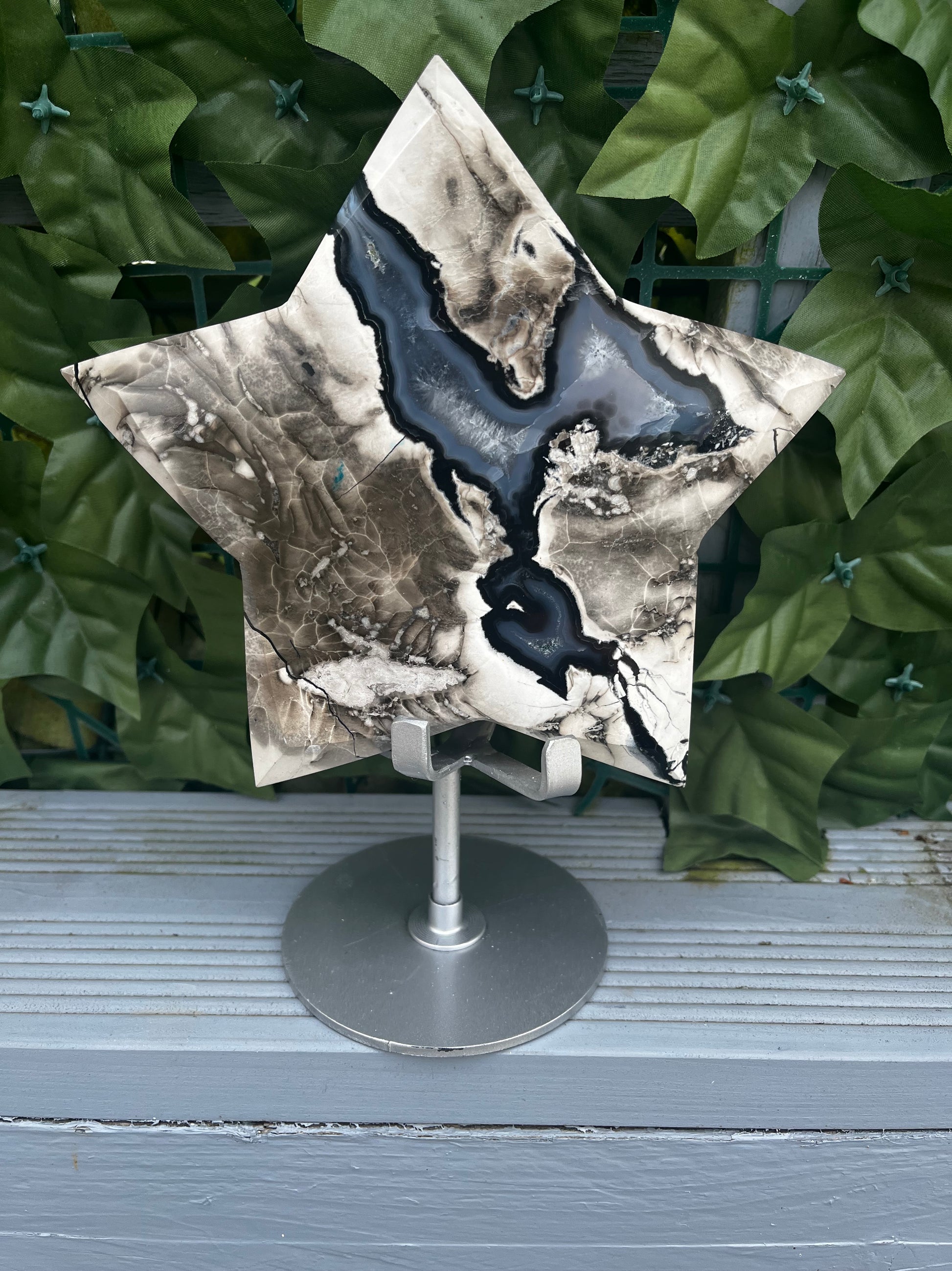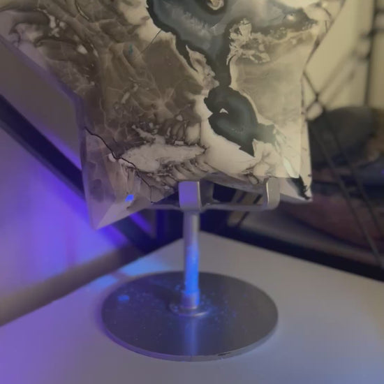 The Volcano Agate piece is a stunning and unique mineral specimen, weighing approximately 1.02kg. This polished piece has stunning UV reaction which is visible in the videos, adding an extra element of interest to its appearance. The white, grey, black and blue pattern is so beautiful on this chunky piece. The star has areas displaying the beautiful white crystals beneath. At its widest point this piece measures approximately 15cm and is 3cm in thickness. Perfect for collectors or those interested in the beauty of minerals and crystals, this Volcano Agate piece is sure to make a striking statement in any space. Please view matching pieces.